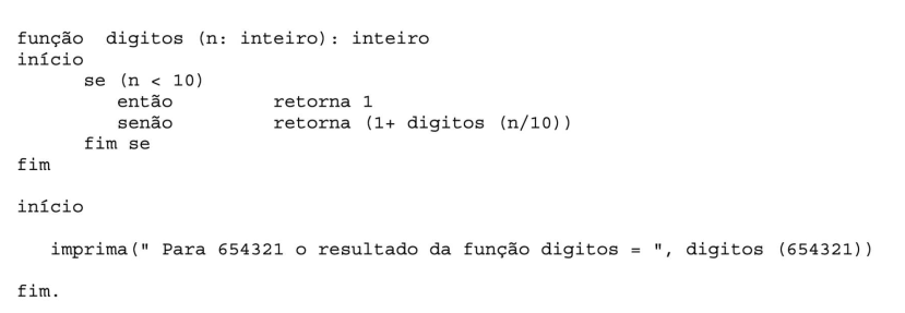 Considerando que o operador / realiza a divisão inteira, ao executar o algoritmo acima será impresso: Para 654321 o resultado da função digitos =