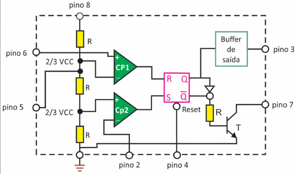 Um analista técnico eletrônico deseja montar um circuito eletrônico de acionamento de um motor DC. Para evitar desperdício de energia elétrica, o acionamento deverá ser feito com o dispositivo de potência que aciona o motor operando em corte-saturação. Para transformar o sinal analógico de tensão de acionamento em um sinal em corte e saturação para o motor, o analista pretende usar o CI 555, cujo diagrama interno é mostrado abaixo.