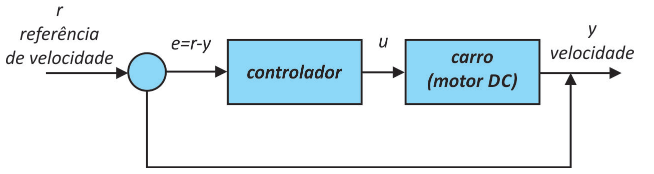 Um analista técnico eletrônico deseja montar um circuito eletrônico de controlador. O objeto controlado (planta) é um motor DC que faz mover um carro. A variável a ser controlada y é a velocidade do carro. O sinal de controle u é a tensão DC aplicada ao motor. O sinal de entrada do controlador é o erro e, isso é, a diferença entre a referência de velocidade r e a velocidade medida do carro y. Considere a situação de referência diferente de zero e regime permanente.