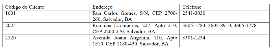 Normalização de dados é um procedimento que examina os atributos de uma entidade para evitar eventuais anomalias na inclusão, na exclusão ou na alteração de uma ocorrência específica de uma entidade. A Tabela fictícia apresentada a seguir, que representa o cadastro de clientes de uma determinada empresa, não foi elaborada de acordo com a Primeira Forma Normal (1FN).