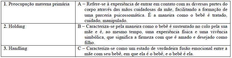 Winnicott no desenvolvimento das suas pesquisas teve como foco questões relacionadas ao crescimento emocional do bebê e a relação entre a mãe e o bebê. Relacione as funções da mãe com as suas definições.