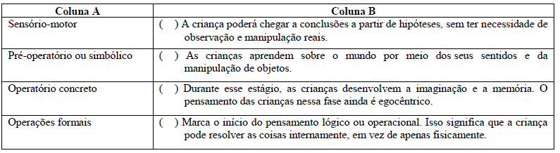 Jean Piaget distinguiu quatro grandes períodos no desenvolvimento das estruturas cognitivas, intimamente relacionados ao desenvolvimento da afetividade e da socialização da criança. Nesse contexto, associe cada fase às suas características.