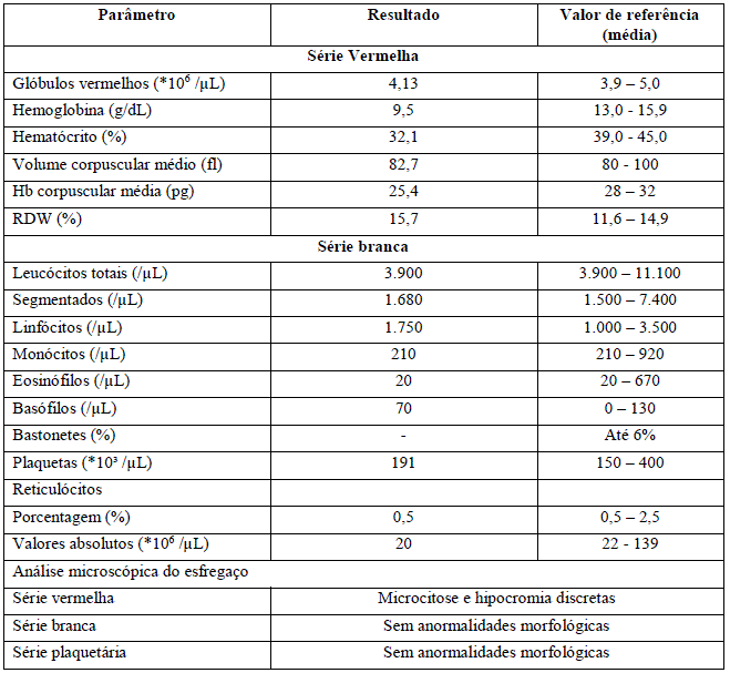 Ao solicitar os exames de rotina para um paciente adulto (50 anos) que será submetido a uma exodontia, o Cirurgião-Dentista recebeu o resultado do hemograma abaixo: