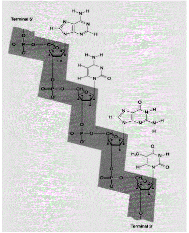 I. Uma ligação fosofodiéster conecta o átomo de carbono 5’ de uma desoxirribose ao átomo de carbono 3’ da desoxirribose adjacente, formando uma polaridade ou sentido 5’- 3’essencial na compreensão de como o DNA atua no metabolismo.