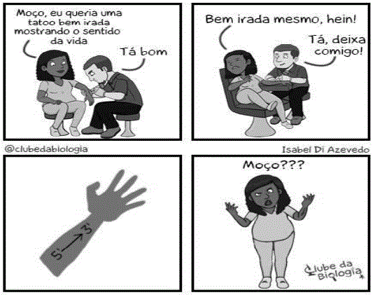 A moça não entende muito de Biologia, mas o tatuador gosta e compreende a importância do Dogma Central e dos sentidos 5’-3’ e 3’-5’.