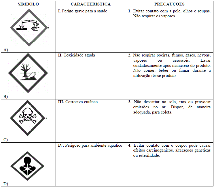 Quem trabalha em laboratórios está sempre exposto a riscos, no entanto a maioria dos acidentes podem ser evitados ao prestar atenção nos métodos de uso e nos símbolos de perigo nos reagentes. Os símbolos de perigo são pictogramas, imagens que representam objetos ou conceitos apenas por meio de desenhos. Criados pelo Globally Harmonized System (GHS), os símbolos de perigo surgiram com o objetivo de definir os perigos específicos de cada produto químico. No Brasil, desde 1998, existe a lei para especificar o perigo de cada produto químico, seja utilizando o sistema do GHS ou por meio de outros tipos de aviso. No quadro abaixo, estabeleça a CORRETA associação entre o símbolo, sua característica e as precauções com seu uso.
