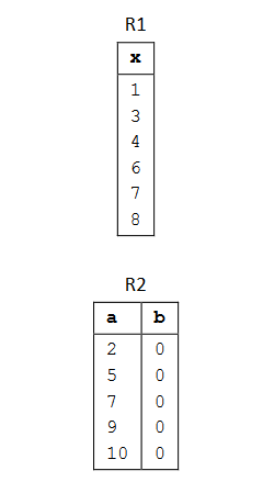 Após a execução do comando, o conteúdo da coluna “b" da tabela R2 passa a ser, de cima para baixo: